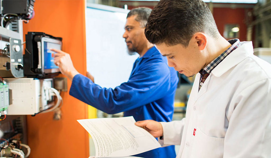 Technicians loading software on a plc