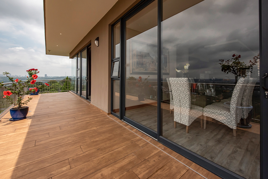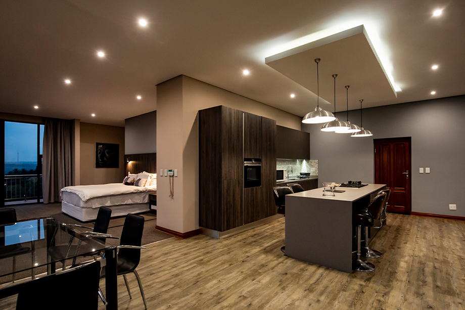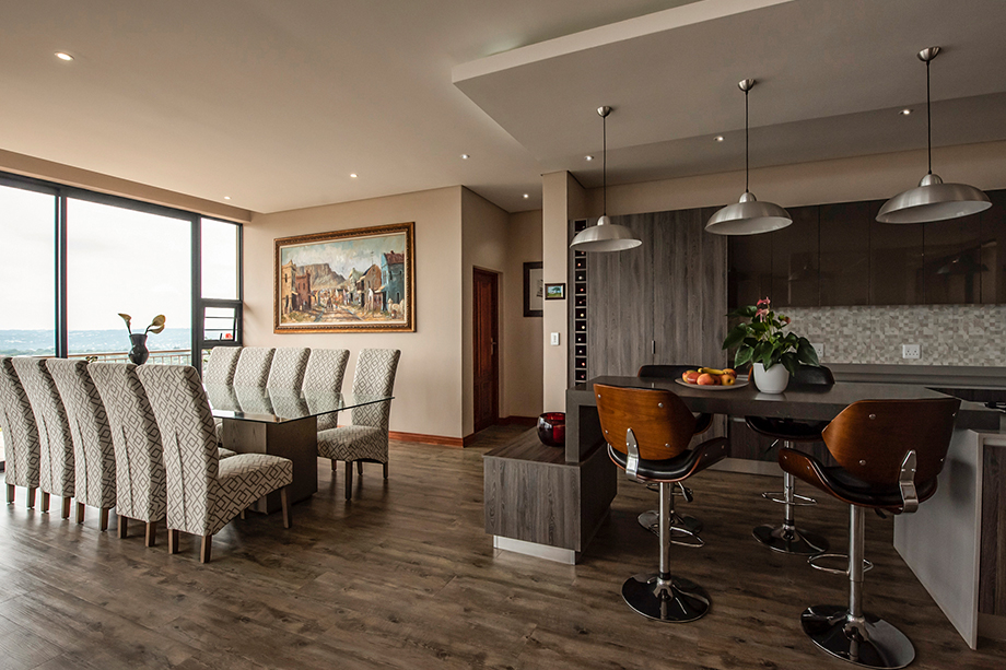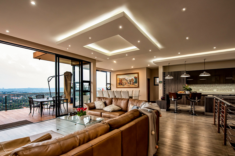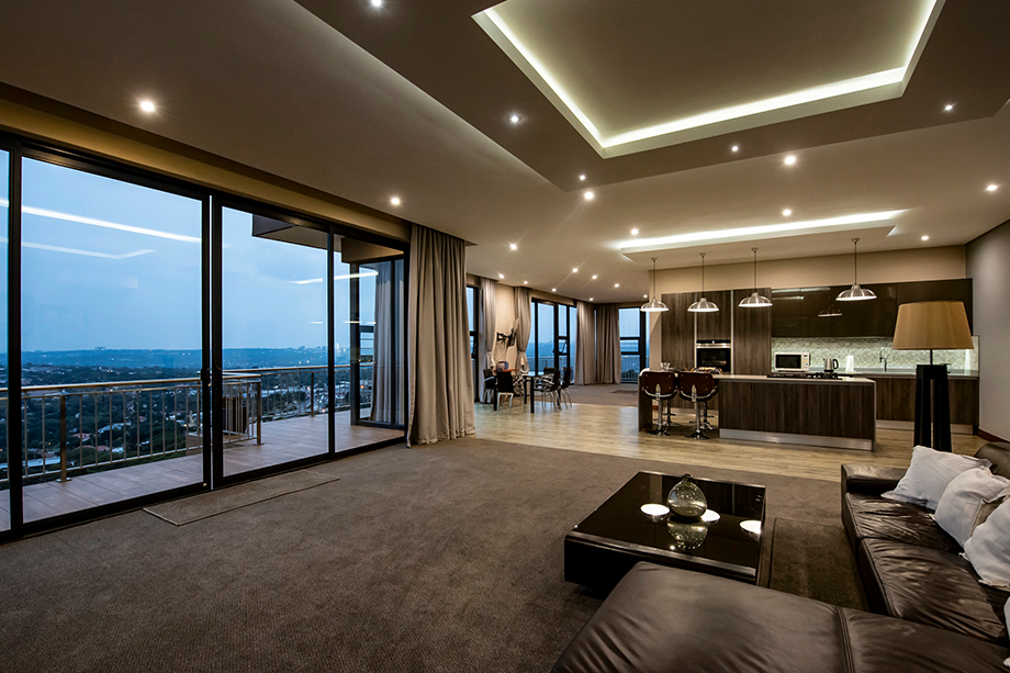 The open plan lounge, dining room and fully fitted kitchen, master bedroom and study all open onto a large patio and have million dollar views of the Johannesburg skyline and its northern suburbs of Sandton, Rosebank and Randburg.