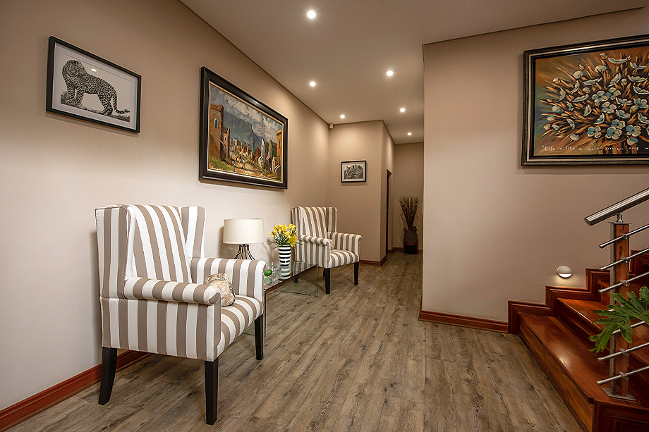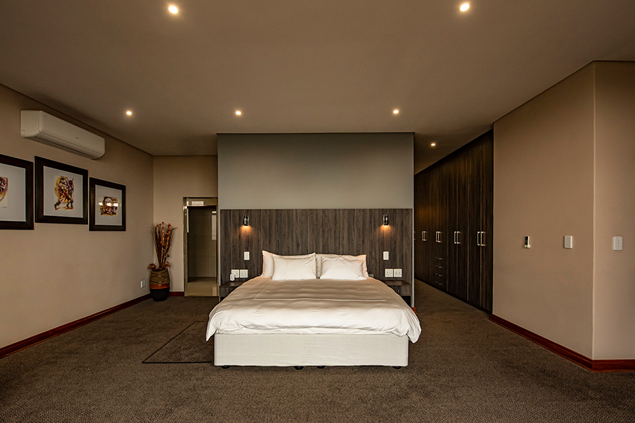 The spacious bedrooms on this floor have full en-suite bathrooms and are equipped with an air conditioner, TV point and ample built-in cupboards. All the rooms open up on a small patio and access to the garden and have stunning views of the skyline of the northern suburbs of Johannesburg.