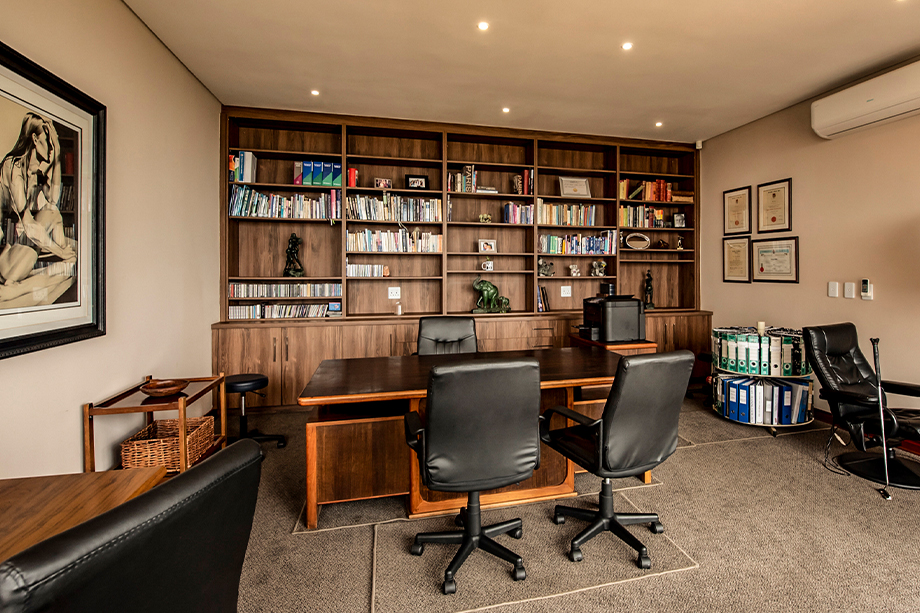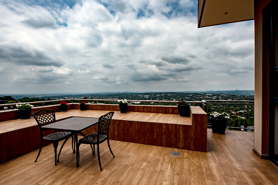 The executive study has a fully walled bookshelf and cupboards, but this room can also serve as a separate lounge or TV room. It has stunning views of the skyline of the Sandton, Rosebank and Randburg and opens up onto the patio.