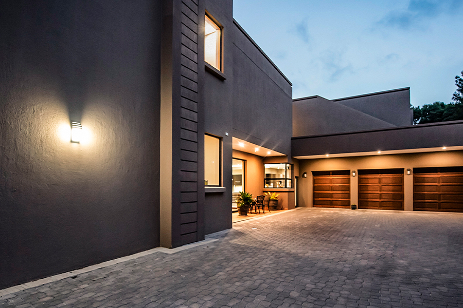 Fully illuminated driveway with runway lighting. Low maintenance garden